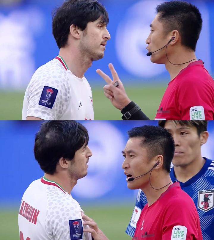 上半场的罚球区事件发生在第44分钟,伊朗队右路起球传中,阿兹蒙在后点试图争顶时倒地,随后他非常激动地向马宁投诉日本队16号每熊晟矢对其有犯规行为。然而,每熊晟矢手臂上虽然与阿兹蒙有接触,但显然还够不上犯规,马宁对此次事件的判罚也是准确无误的。