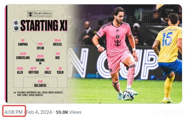 本场比赛于下午4:10左右正式开球,然而迈阿密国际官方赛前却迟迟未公布本场比赛的首发与替补阵容,直到下午4:08分,也就是临近开球时才公布官方的阵容大名单,梅西未被列入其中。