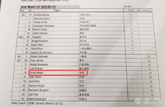 然而,在此前现场版本的纸质大名单中,梅西出现在了替补席当中,不知是否是迈阿密国际方面随后又临时修改了名单。