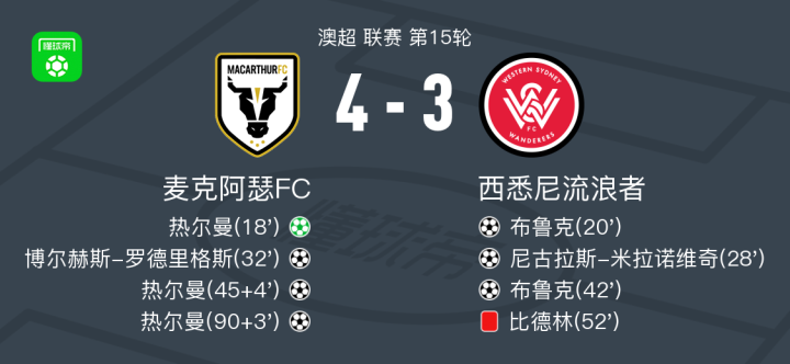 北京时间2月4日澳超 联赛 第15轮,麦克阿瑟FC主场对阵西悉尼流浪者。麦克阿瑟FC热尔曼帽子戏法,博尔赫斯-罗德里格斯破门。西悉尼流浪者布鲁克梅开二度,尼古拉斯-米拉诺维奇破门。最终比分4-3。
