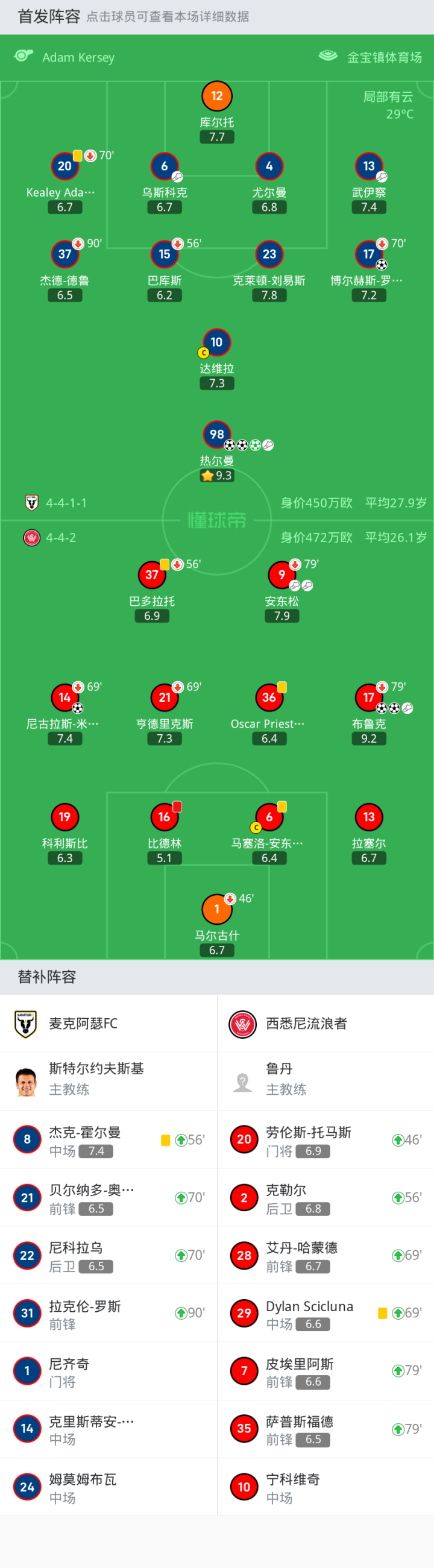 西悉尼流浪者首发:6-马塞洛-安东尼奥, 9-安东松, 21-亨德里克斯, 19-科利斯比, 16-比德林, 1-马尔古什, 17-布鲁克, 13-拉塞尔, 14-尼古拉斯-米拉诺维奇, 37-巴多拉托, 36-Oscar Priestman