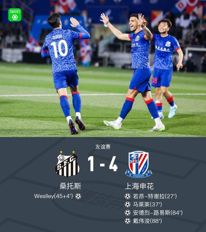 申花4-1桑托斯,特谢拉、马莱莱破门,路易斯、戴伟浚建功