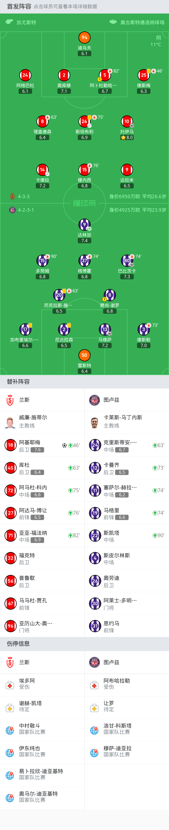 兰斯首发:26-斯坦布利, 5-阿卜杜勒哈米德, 10-托伊马, 25-德斯梅, 15-穆内西, 94-迪乌夫, 2-奥库穆, 9-达拉米, 14-卡德拉, 24-阿格巴杜, 8-理查德森