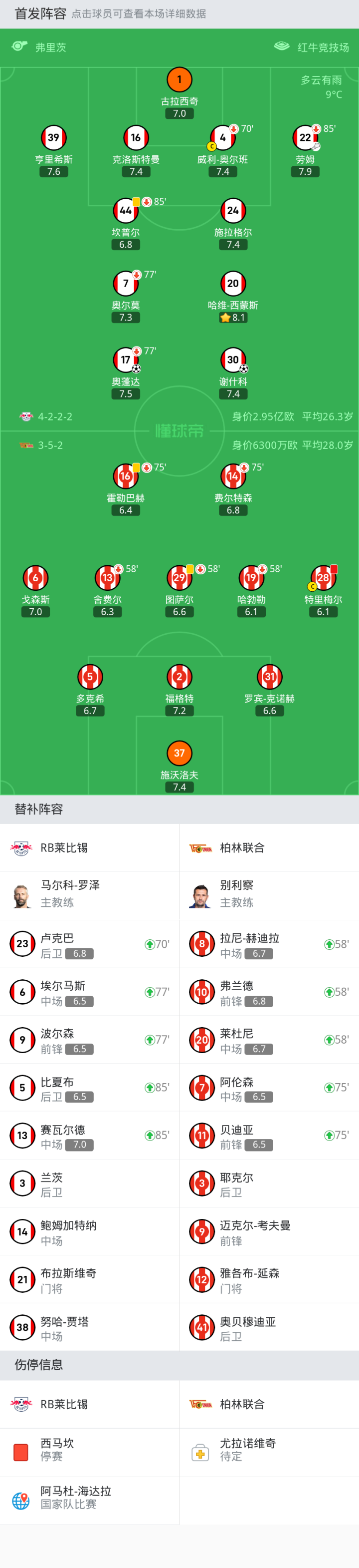 RB莱比锡首发:1-古拉西奇, 44-坎普尔, 4-威利-奥尔班, 16-克洛斯特曼, 39-亨里希斯, 24-施拉格尔, 7-奥尔莫, 22-劳姆, 17-奥蓬达, 30-谢什科, 20-哈维-西蒙斯