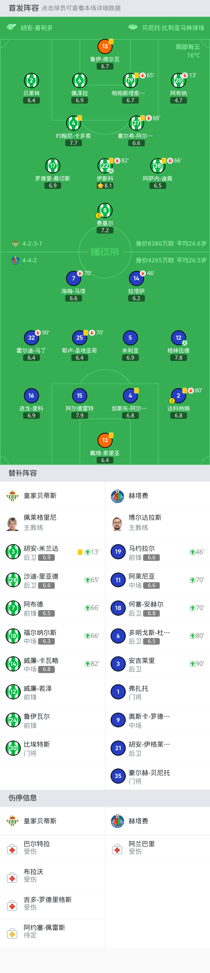 上场替补:82'14-威廉-卡瓦略, 66'18-福尔纳尔斯, 13'3-胡安-米兰达, 66'7-阿布德, 65'28-沙迪-里亚德