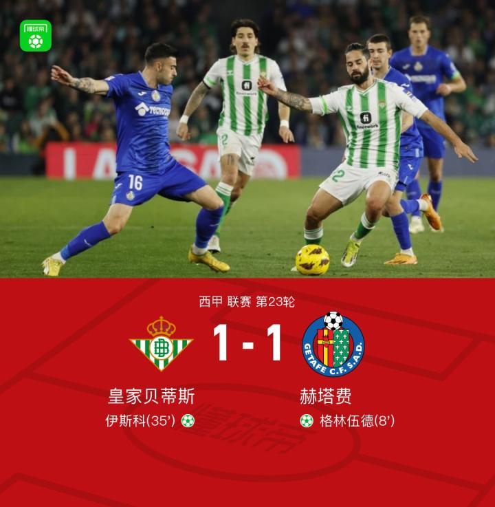北京时间2月5日西甲 联赛 第23轮,皇家贝蒂斯主场对阵赫塔费。上半场,格林伍德造点并亲自主罚命中,伊斯科点射扳平比分。下半场,阿尔德雷特抽射打偏,费基尔抽射被挡出,最终,皇家贝蒂斯1-1赫塔费。