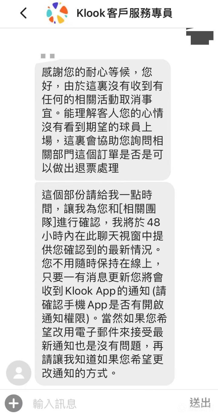 有网友向迈阿密国际中国香港行官方票务合作伙伴Klook询问退票事宜,官方客服回答:“感谢您的耐心等候,您好,由于这里没有收到有关任何的相关活动取消示意,能理解客人您没有看到期望的球员上场的心情,这边会协助您询问相关部门这个订单是否可以做出退票处理。”