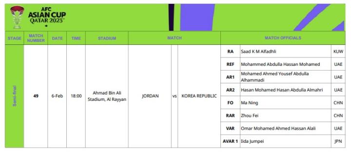 亚足联官方公布了亚洲杯半决赛约旦vs韩国的裁判安排。比赛将于北京时间2月6日23:00进行。