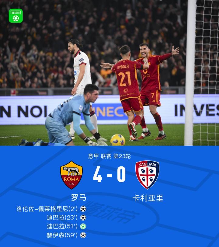 【罗马4-0卡利亚里迎3连胜,迪巴拉双响,佩7传射,赫伊森首球】