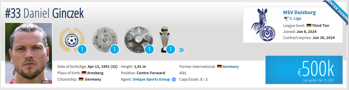 2024年冬窗,他刚转会到德丙联赛的杜伊斯堡效力。