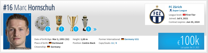 德国U21国脚:霍恩舒在多特蒙德效力长达13年。在大黄蜂效力期间一直为二队踢球,从未拿到过正赛季机会。不过他依然拿到了两个德甲冠军。小伙子运气不错。