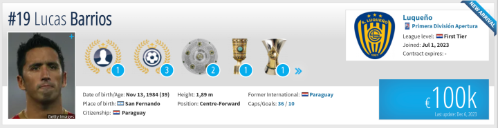 2023年,巴拉圭卢克尼奥竞技宣布免签巴里奥斯。39岁高龄的巴里奥斯仍活跃在赛场上。已经为卢克尼奥竞技打进4球了,可谓宝刀不老。