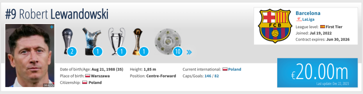 如今的莱万已年满35岁,德转身价只有20m了。和拜仁巅峰时期是没法比较了。但仍然是巴萨的绝对得分点。
