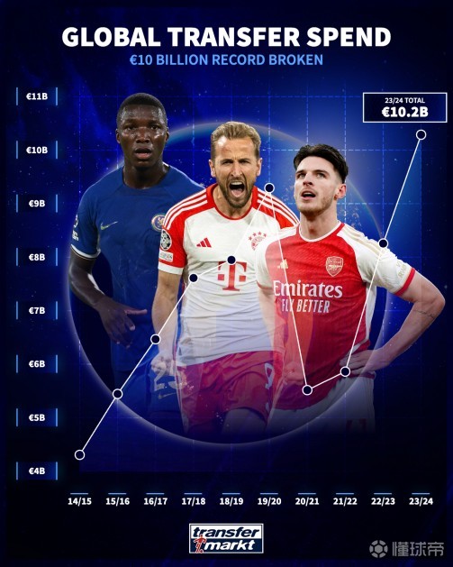创单赛季纪录!23/24赛季世界足坛转会支出突破100亿欧