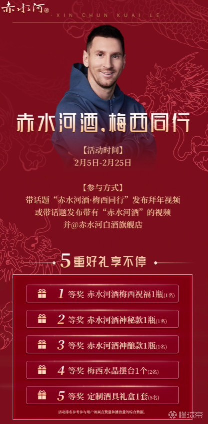 今年1月,梅西与中国白酒品牌“赤水河白酒”达成代言协议,梅西的“签字祝福款”白酒也于随后正式发售,据悉,该产品为53度酱香型白酒,每瓶500ml,单瓶售价1499元,6瓶整箱装售价为6600元,全球限量1万瓶。