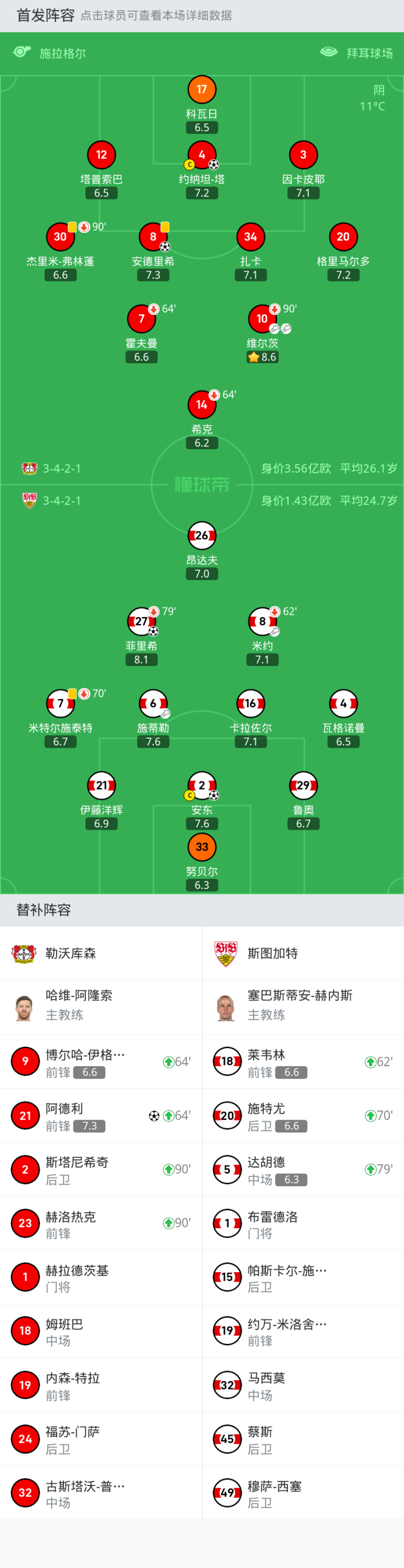 勒沃库森首发:34-扎卡, 7-霍夫曼, 20-格里马尔多, 8-安德里希, 4-约纳坦-塔, 14-希克, 12-塔普索巴, 17-科瓦日, 30-杰里米-弗林蓬, 3-因卡皮耶, 10-维尔茨