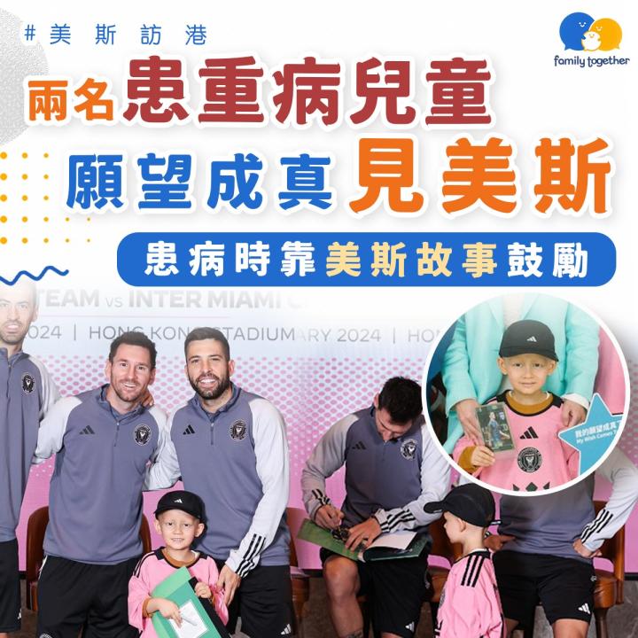 据香港Make-A-Wish Hong Kong愿望成真基金分享,梅西访问香港期间与两名患病儿童合照,并为他们送上签名。
