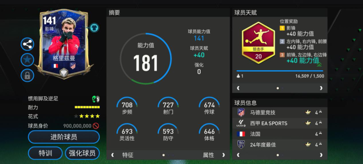 年度最佳格里兹曼配备了狙击手天赋,提升了他的远射、盘带与抢点能力,搭配影锋位置,他的“隐藏杀手”作用会更加突出,在实战中能带给玩家足够多的惊喜。