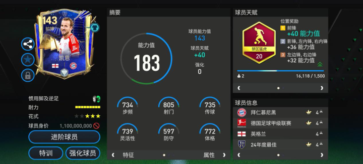 配备禁区猛虎天赋后,凯恩的体格数据得到了极大程度的加强,他原本的短板得到了补充,射术则得到了进一步的提升,除此之外,他双速、灵活性等方面的数据也保持在版本第一线的水平,这张年度最佳凯恩或将成为德甲球迷们的最大惊喜。