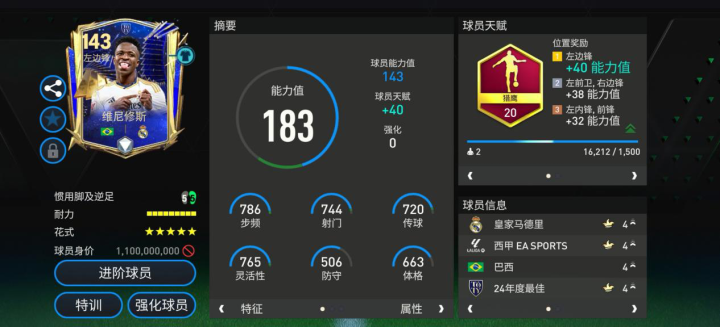 维尼修斯给到了最适合他的猎鹰天赋,基础能力值也给到了143,使得他在一众西甲联赛球员中脱颖而出,他本身双速就很强势,灵活性与射术提升之后,门前效率也得到了显著提高。