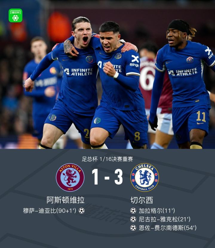 北京时间2月8日足总杯 1/16决赛重赛,阿斯顿维拉主场对阵切尔西。切尔西流畅配合,马杜埃凯回做,加拉格尔劲射破门。十分钟后,古斯托传中,雅克松头球破门。下半场,恩佐造任意球,随后亲自主罚命中,皮球直挂死角。比赛最后时刻,迪亚比弧顶处推射破门,为维拉扳回一城。战罢,最终比分1-3。