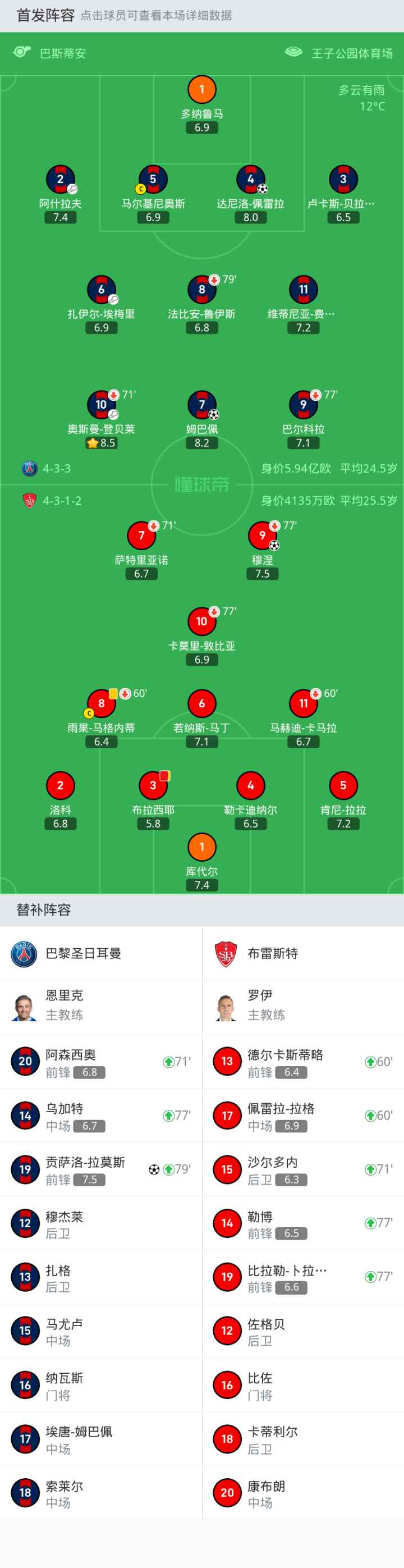 替换下场:71'10-奥斯曼-登贝莱, 79'8-法比安-鲁伊斯, 77'9-巴尔科拉