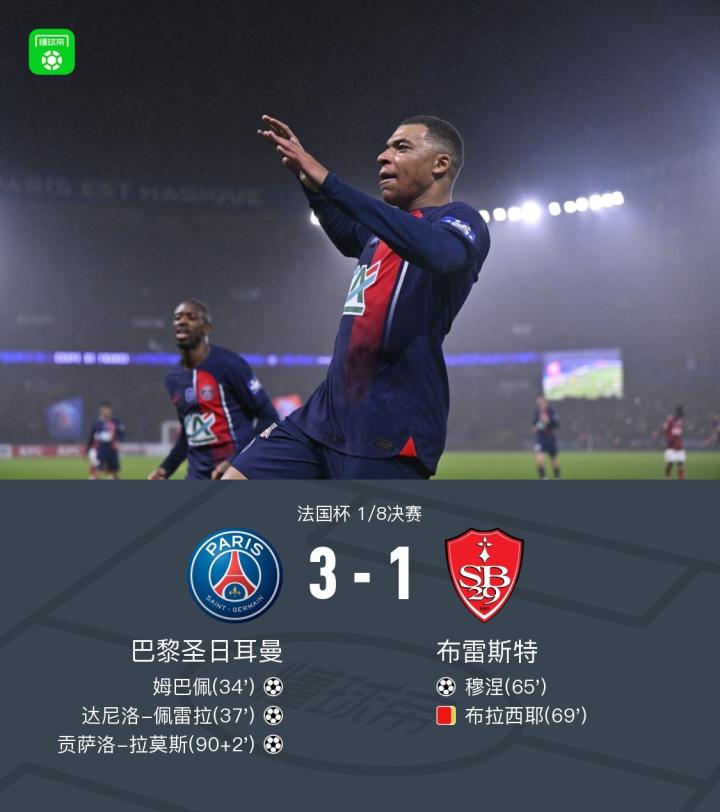 北京时间2月8日法国杯 1/8决赛,巴黎圣日耳曼主场对阵布雷斯特。上半场,萨特里亚诺弧线球兜射中柱,马格内蒂凌空抽射被扑,埃梅里助攻姆巴佩爆射破门,登贝莱横传助攻佩雷拉抢点破门,姆巴佩单刀挑射被扑后中楣,登贝莱零角度似传似射中柱;下半场,佩雷拉和登贝莱先后打门均被扑,穆涅头槌入网扳回一球,布拉西耶踩到姆巴佩脚踝两黄变一红被罚下,姆巴佩大力抽射被扑,补时阶段阿什拉夫助攻拉莫斯空门吃饼。最终比分3-1。