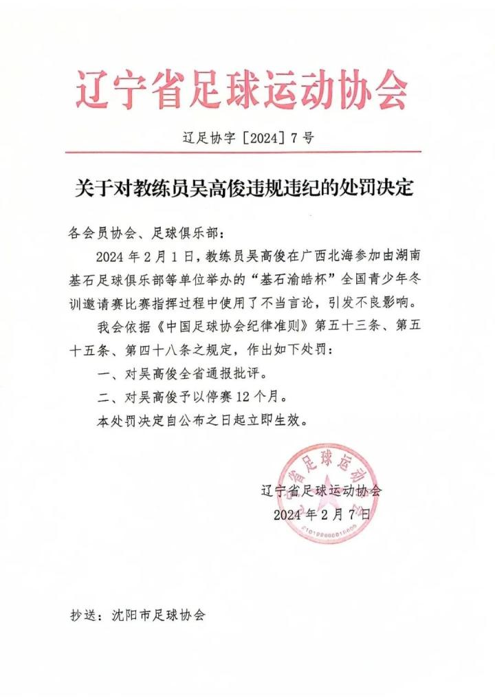 2024年2月1日,在“基石·渝皓杯”全国青少年冬训邀请赛中,沈阳奥飒启星足球俱乐部队教练员发生违纪违规行为。今天,辽宁足协、沈阳足协对此事件做出了处罚决定。青少年足球领域必须保持绝对的纯净,纯粹,营造青少年足球发展的良好环境,需要大家共同努力。中国足球协会对此事件高度关注,正展开调查,并将根据调查结果对相关俱乐部和人员进行进一步处理。