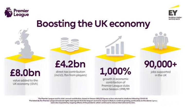 英超21-22赛季为英国经济贡献80亿英镑和9万岗位,纳税42亿镑