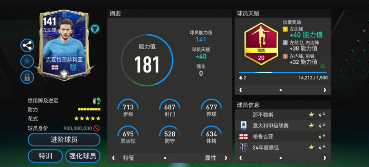 克瓦拉茨赫利亚在上赛季异军突起,连续摆脱过人是他的绝活,他的定位也一直是灵活型边锋。24TOTY配备了猎鹰天赋后,他的速度、传球与射门属性得到了加强,大幅度提升了他的门前效率。