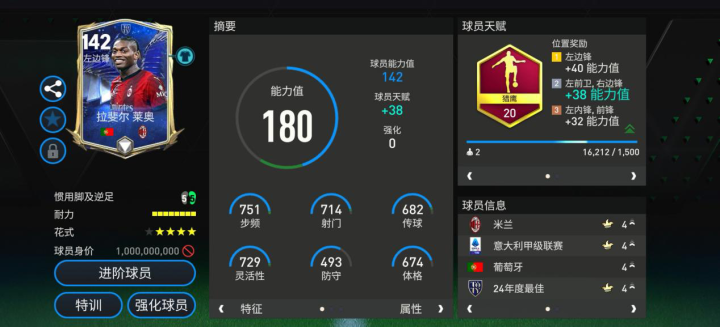 莱奥是身体流边锋的杰出代表,对抗能力突出,绝对速度强势,搭配猎鹰天赋后,他的双速进一步加强,灵活性也得到了提高,过人成功率更高,能更长时间的有效持球。