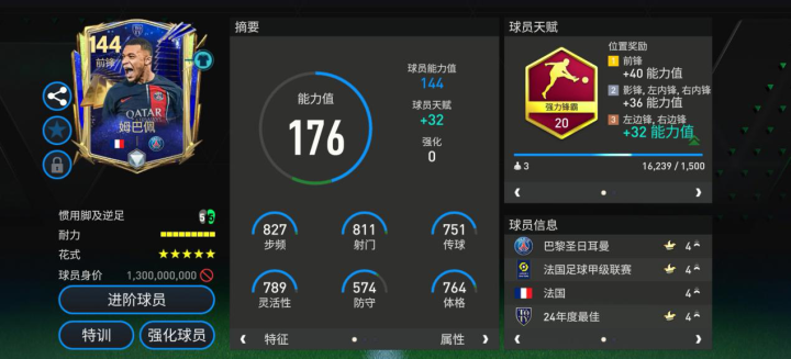 作为法甲赛场的头牌前锋,姆巴佩本次在本次TOTY活动中直接以初始144能力值的“准卡王”身份出场,排面十足。配备强力锋霸天赋后,他的步频与射门两项属性都突破了800,配备五星花式与满格耐力,实战表现极为出色。