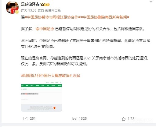 此前有媒体人声称,中国足协与阿根廷足协停止合作,官网也删除了梅西相关新闻。此消息备受质疑,上游新闻今天联系了几位足协人士求证此事,对方均表示未听说过。