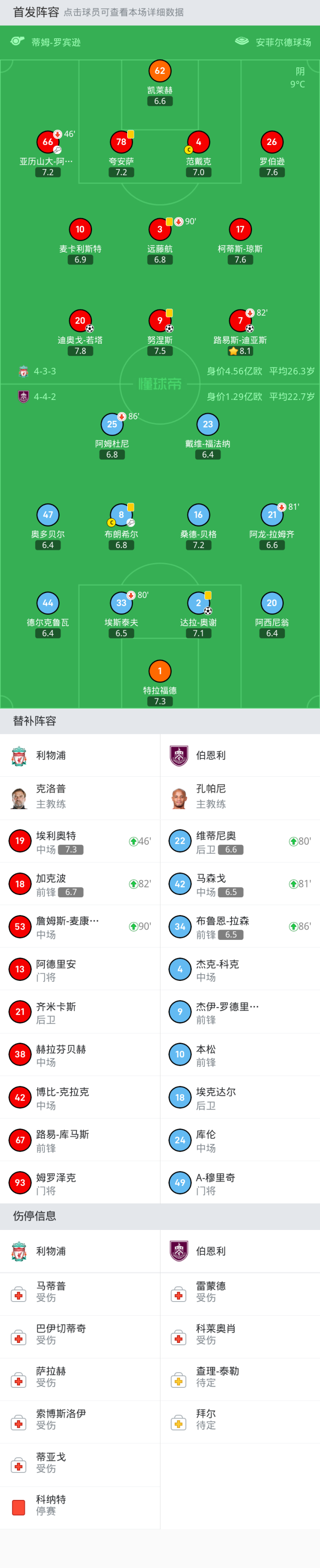 替换下场:90'+63-远藤航, 46'66-亚历山大-阿诺德, 82'7-路易斯-迪亚斯