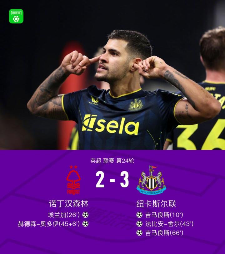 纽卡3-2客胜诺丁汉森林,吉马良斯双响,埃兰加、奥多伊破门