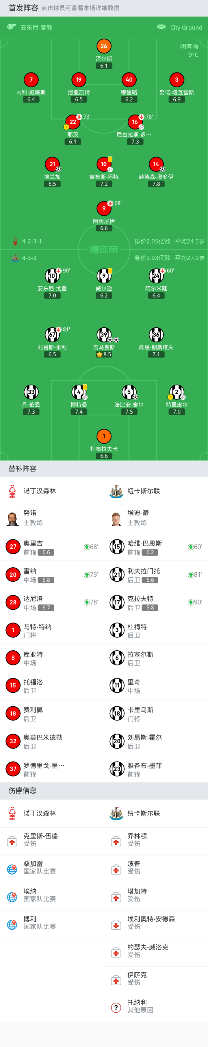 诺丁汉森林首发:26-泽尔斯, 9-阿沃尼伊, 19-尼亚凯特, 10-吉布斯-怀特, 14-赫德森-奥多伊, 22-耶茨, 16-尼古拉斯-多明格斯, 3-努诺-塔瓦雷斯, 7-内科-威廉斯, 21-埃兰加, 40-穆里略