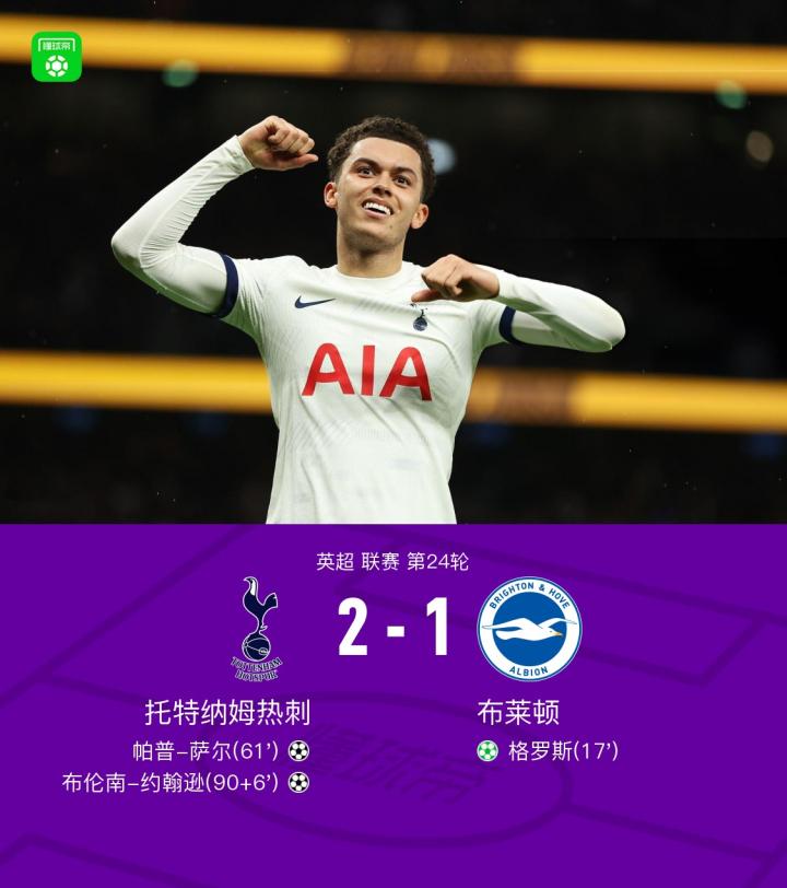 【剑南春|热刺2-1逆转布莱顿,孙兴慜助攻布伦南-约翰逊绝杀】