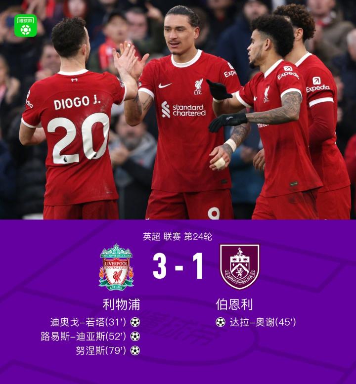 【剑南春|利物浦3-1伯恩利,努涅斯、迪亚斯、若塔均头槌破门】