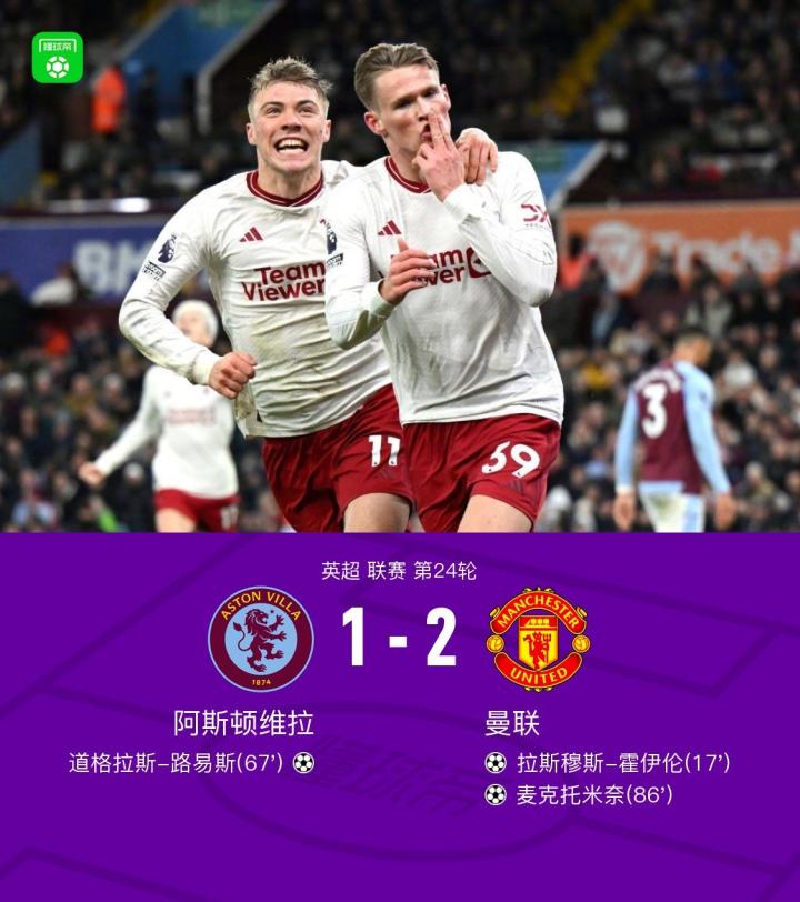 北京时间2月12日00:30,英超第24轮焦点战,曼联作客维拉公园球场挑战阿斯顿维拉,本场主裁判为罗伯特-琼斯。上半场,马奎尔头球摆渡助攻霍伊伦推射破门,奥纳纳屡献关键扑救。下半场,道格拉斯-路易斯扳平比分,达洛特精准传中助攻麦克托米奈头槌绝杀。最终,曼联客场2-1力克维拉。