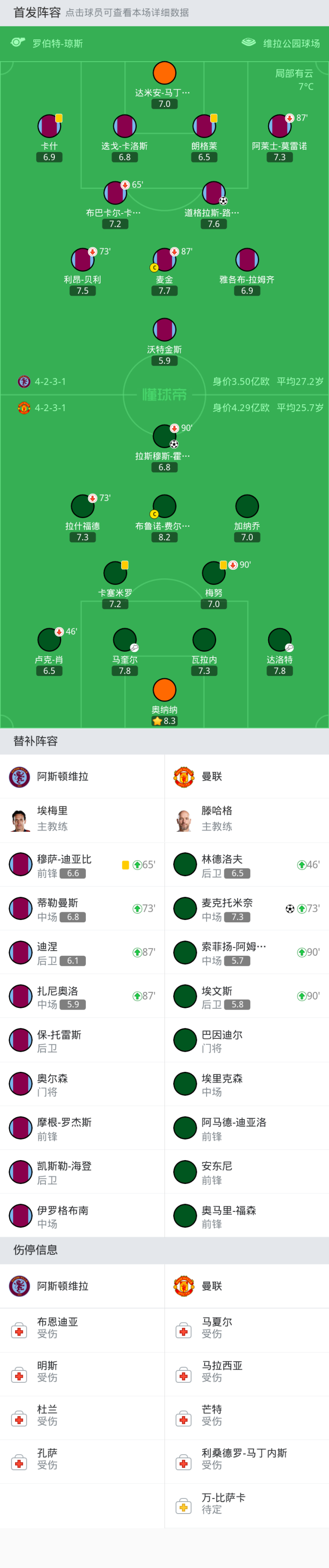 阿斯顿维拉首发:1-达米安-马丁内斯, 17-朗格莱, 15-阿莱士-莫雷诺, 7-麦金, 3-迭戈-卡洛斯, 11-沃特金斯, 31-利昂-贝利, 44-布巴卡尔-卡马拉, 2-卡什, 6-道格拉斯-路易斯, 41-雅各布-拉姆齐