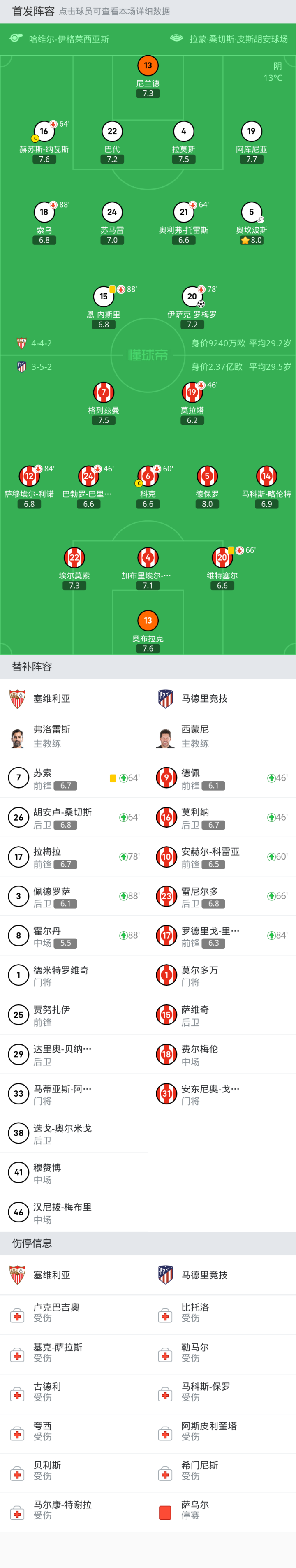 替换下场:64'16-赫苏斯-纳瓦斯, 64'21-奥利弗-托雷斯, 88'18-索乌, 88'15-恩-内斯里, 78'20-伊萨克-罗梅罗
