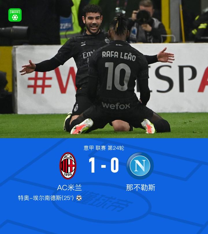 北京时间2月12日意甲联赛第24轮,AC米兰主场对阵那不勒斯。上半场,莱奥助攻,特奥冷静低射打破僵局。下半场,西米奇解围击中差点自摆乌龙。全场比赛结束,米兰主场1-0小胜那不勒斯。