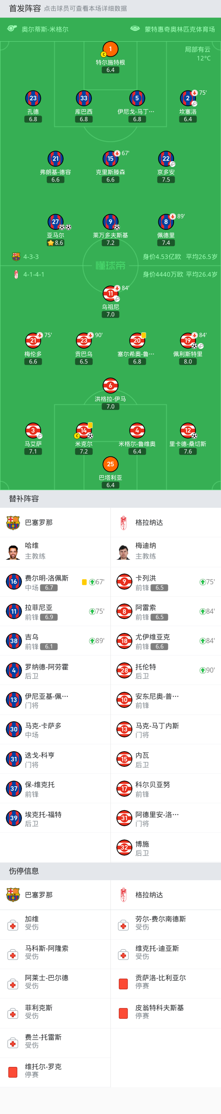 格拉纳达首发:14-米克尔, 25-巴塔利亚, 23-贡巴乌, 11-乌祖尼, 3-马艾萨, 21-梅伦多, 20-塞尔希奥-鲁伊斯, 6-洪格拉-伊马, 4-米格尔-鲁维奥, 19-佩利斯特里, 12-里卡德-桑切斯