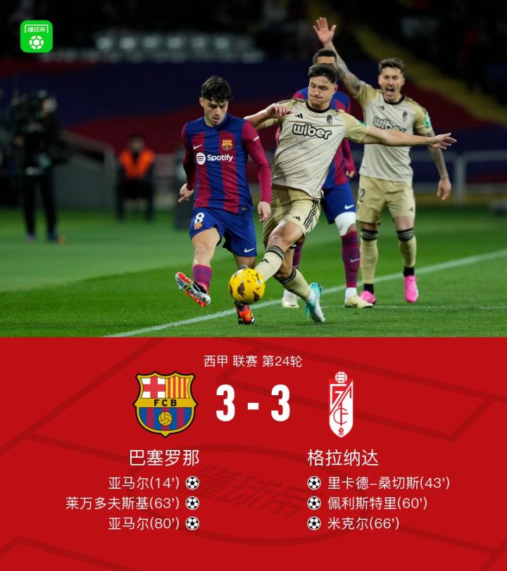 北京时间2月12日西甲 联赛 第24轮,巴塞罗那主场对阵格拉纳达。上半场,坎塞洛助攻亚马尔推射破门,莱万推射被封堵,里卡德-桑切斯扳平比分。下半场,佩利斯特里推射破门,莱万低射建功,米克尔头槌,亚马尔远射扳平,最终,巴萨3-3格拉纳达。