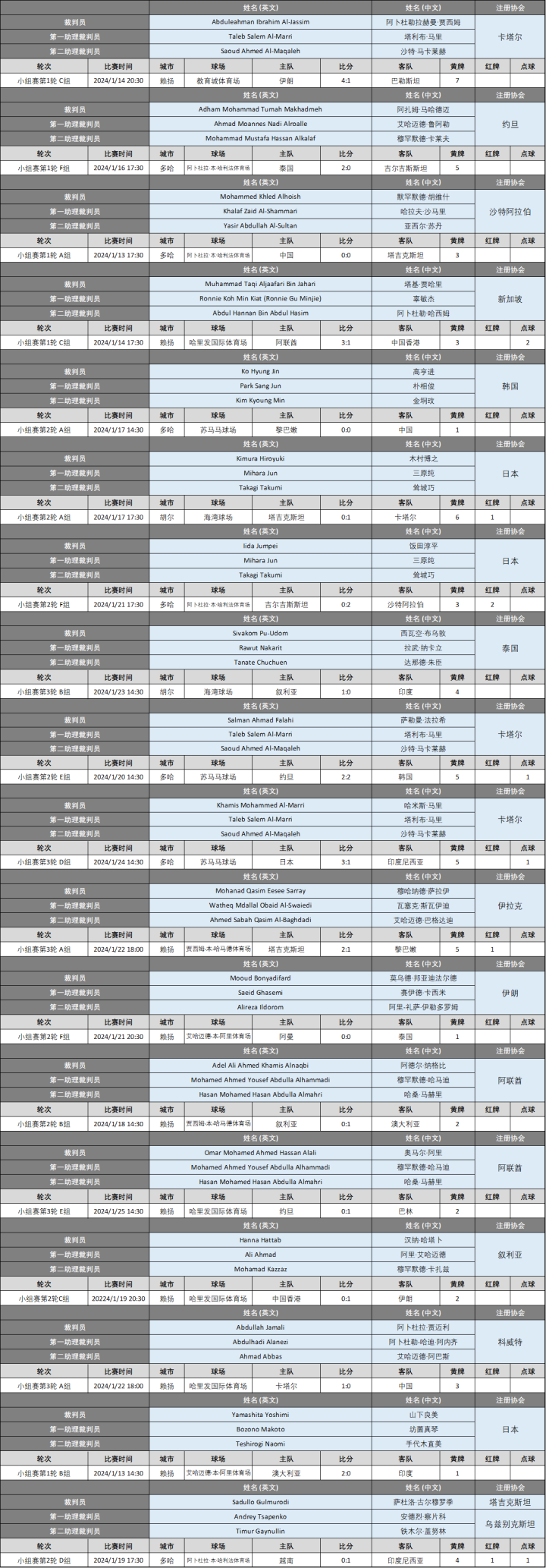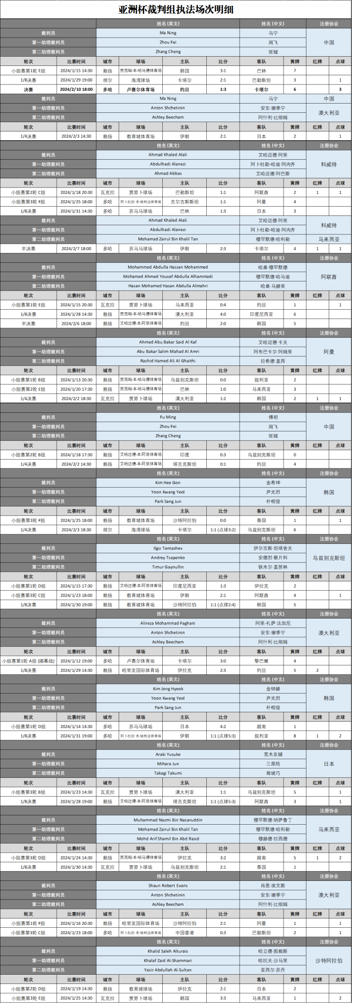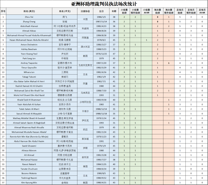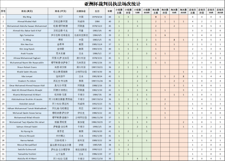 附:卡塔尔亚洲杯裁判组执法场次明细