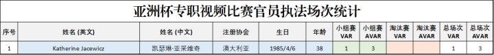 此外,本届亚洲杯的“幕后”同样也有女裁判的身影,即前文中提到过的澳大利亚名哨凯瑟琳·亚采维奇(Katherine Margaret Jacewicz)。亚采维奇1985年4月6日出生于澳大利亚新南威尔士洲,2011年晋升为国际级裁判员。2019/20赛季,她执法了墨尔本城对阵纽卡斯尔喷气机的澳超联赛,成为了史上首位执法澳超的女性裁判。她还执法过2016年U17女足世界杯,以及2019和2023两届女足世界杯等国际大赛。由于患有一种罕见的脊柱疾病,亚采维奇不得不被迫挂哨,并以“专职视频助理裁判员”的身份参与亚洲杯的执法工作。最终,亚采维奇在小组赛中担任了1场VAR以及3场AVAR。