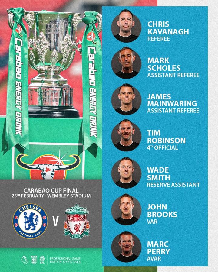 切尔西对阵利物浦的英格兰联赛杯决赛将会在北京时间2月25日23:00开球,目前本场比赛的裁判组人选已经被公布。