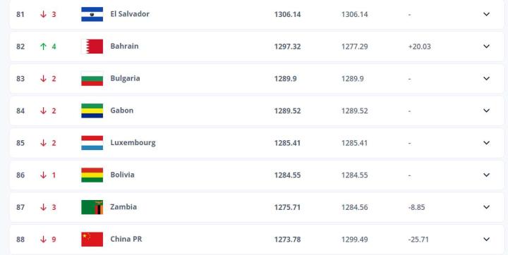 FIFA最新一期国家队排名,中国队下降至88位。...鹰眼看世界 @懂球帝2024-02-15 18:39FIFA最新一期国家队排名,中国队下降至88位。 目前,排名中国队身前,距离中国队最近的各大洲球队如下 亚洲-巴林 欧洲-卢森堡 中北美及加勒比地区-萨尔瓦多 南美洲-玻利维亚 非洲-赞比亚 大洋洲排名最高的新西兰目前FIFA排名第103,在国足身后。 那么,国足踢上述球队,有几成胜算展开更多