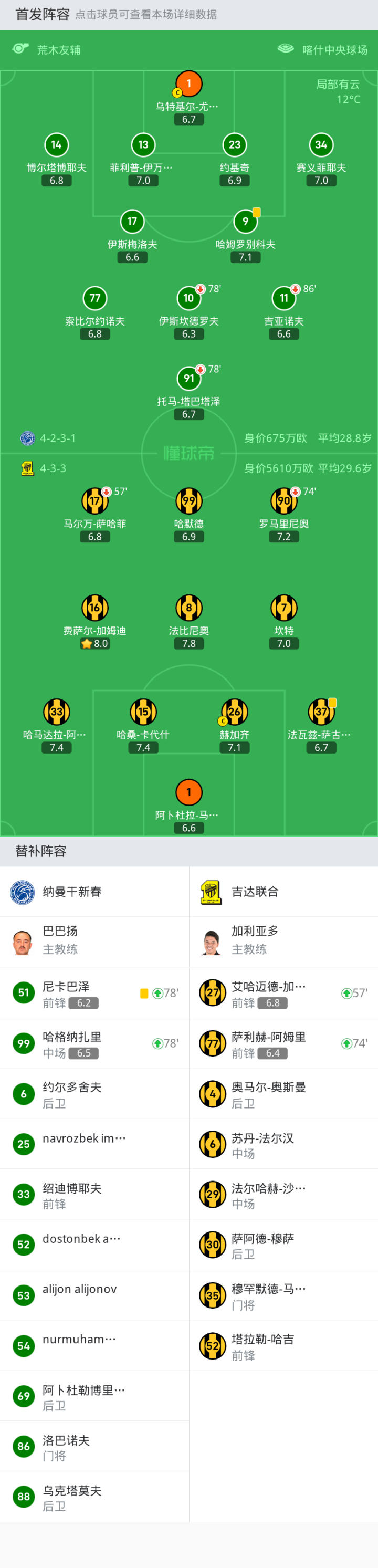 替补:86-洛巴诺夫, 6-约尔多舍夫, 54-nurmuhammad toshpolatov, 33-绍迪博耶夫, 69-阿卜杜勒博里耶夫, 88-乌克塔莫夫, 53-alijon alijonov, 25-navrozbek iminjonov, 52-dostonbek abdulxayev