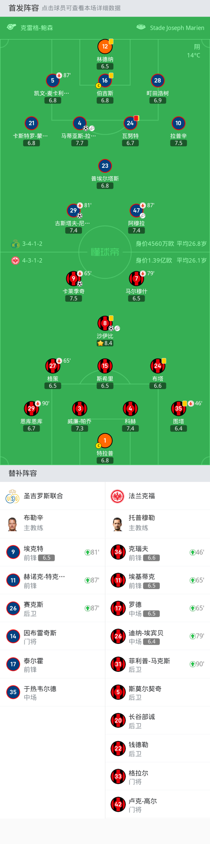 法兰克福首发:1-特拉普, 27-格策, 15-斯希里, 24-布塔, 9-卡莱季奇, 4-科赫, 7-马尔穆什, 29-恩库恩库, 35-图塔, 3-威廉-帕乔, 8-沙伊比